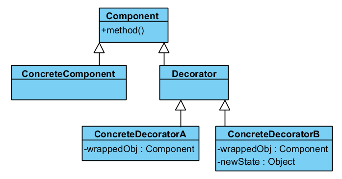 - ConcreteDecorator에는 그 객체가 장식하고 있는 것(데코레이터가 감싸고 있는 Component 객체)을 위한 인스턴스 변수가 있습니다.